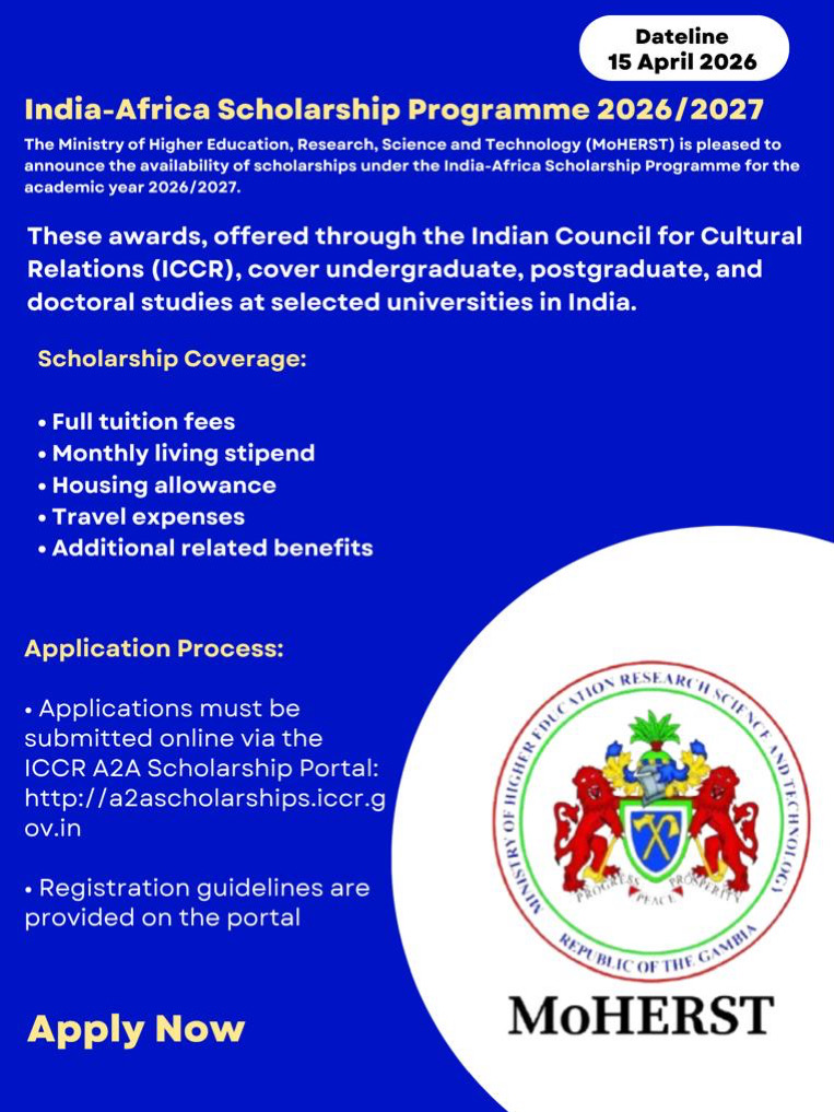 The Ministry of Higher Education, Research, Science and Technology (MoHERST) is pleased to announce the availability of scholarships under the India-Africa Scholarship Programme for the academic year 2026/2027.