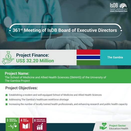 The Ministry of Higher Education, Research, Science, and Technology is pleased to announce that at the 361st meeting of the Islamic Development Bank (IsDB), the Board of Executive Directors has approved US $ 32.20 Million for The Gambia, to help fund the establishment of the “School of Medicine and Allied Health Sciences (SMAHS)” at the University of The Gambia Faraba Banta Campus.