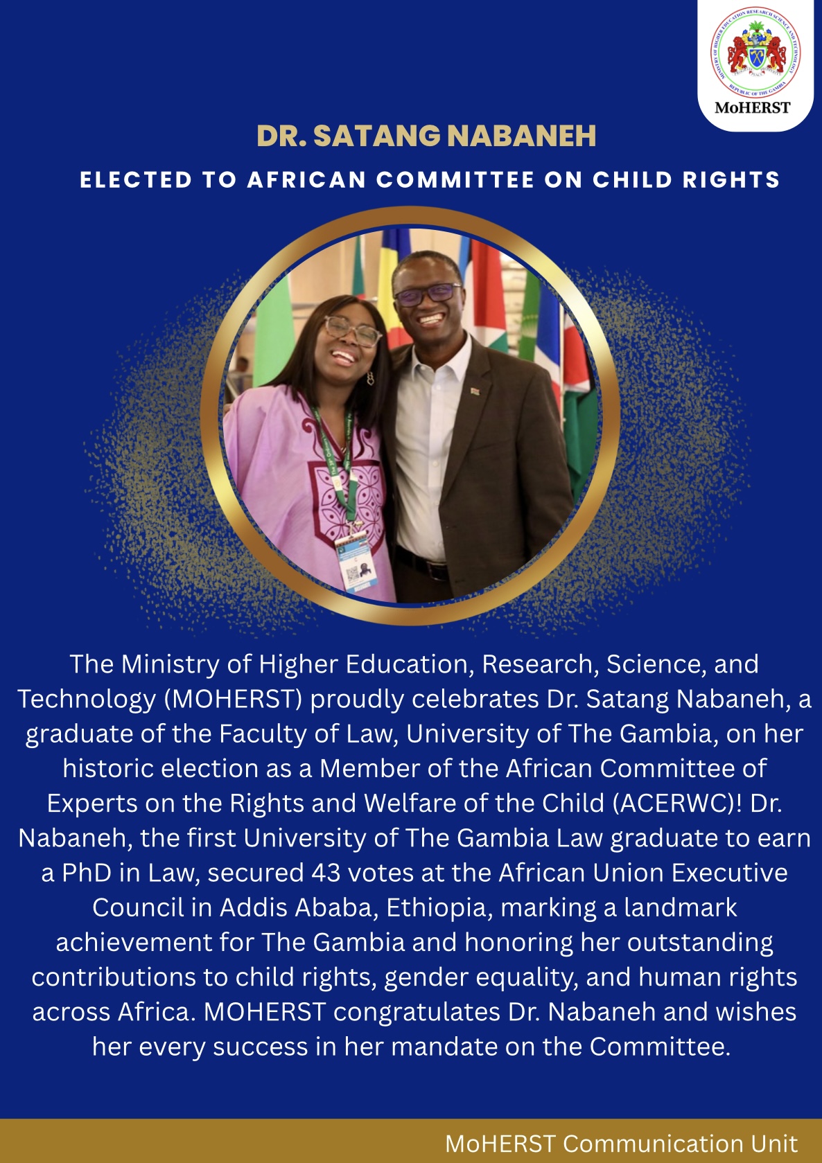 The Ministry of Higher Education, Research, Science, and Technology (MOHERST) proudly celebrates the historic achievement of Dr. Satang Nabaneh, a distinguished graduate of the Faculty of Law, University of The Gambia (UTG), on her election as a Member of the African Committee of Experts on the Rights and Welfare of the Child (ACERWC).